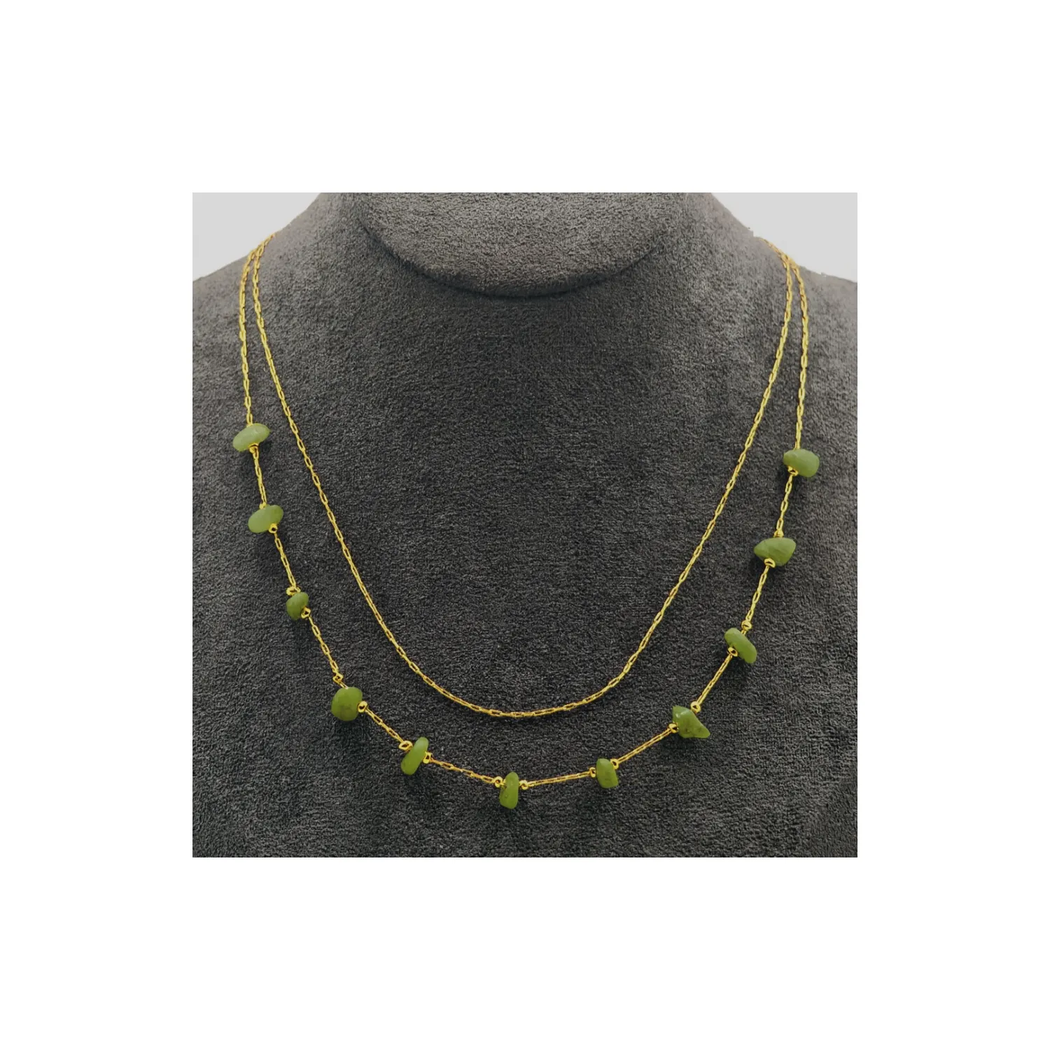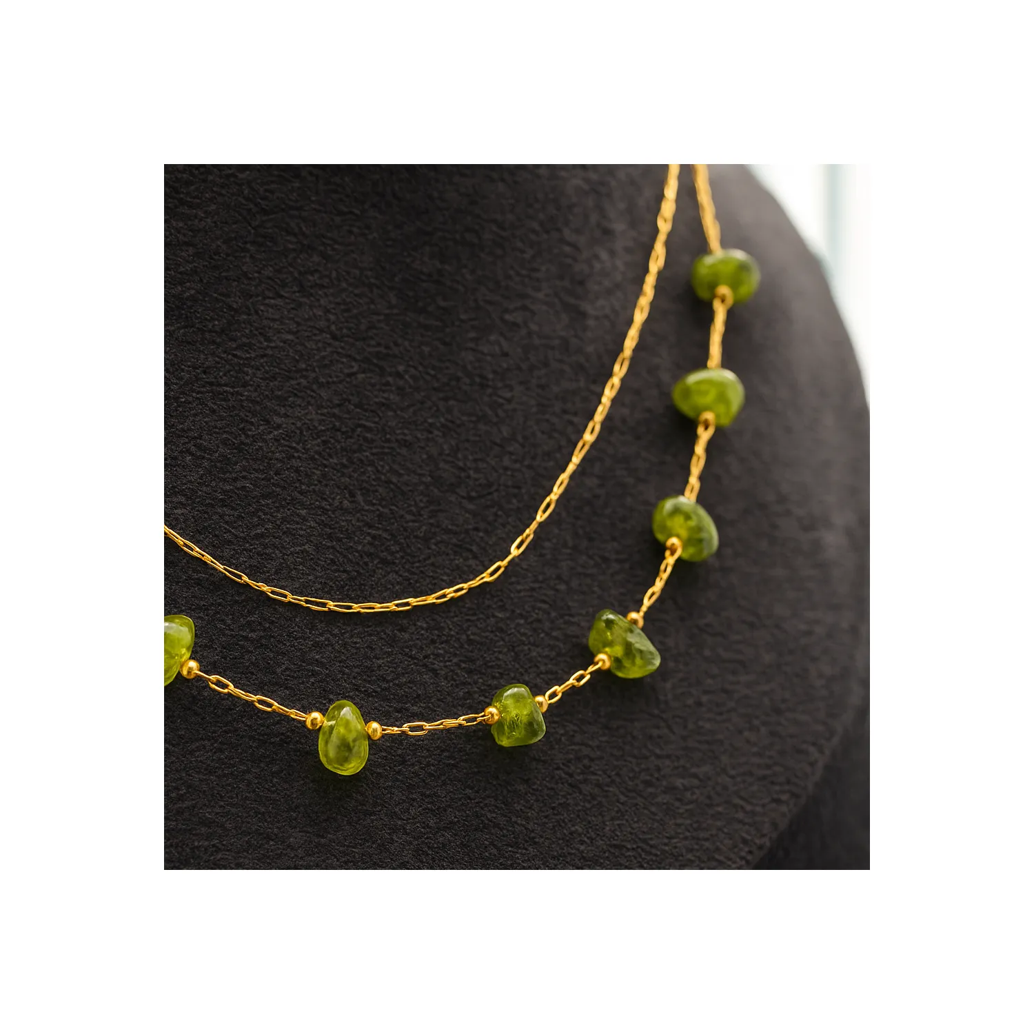La doppia catenina in acciaio color oro dona luce al décolleté, mentre il peridoto aggiunge una nota di energia e positività.